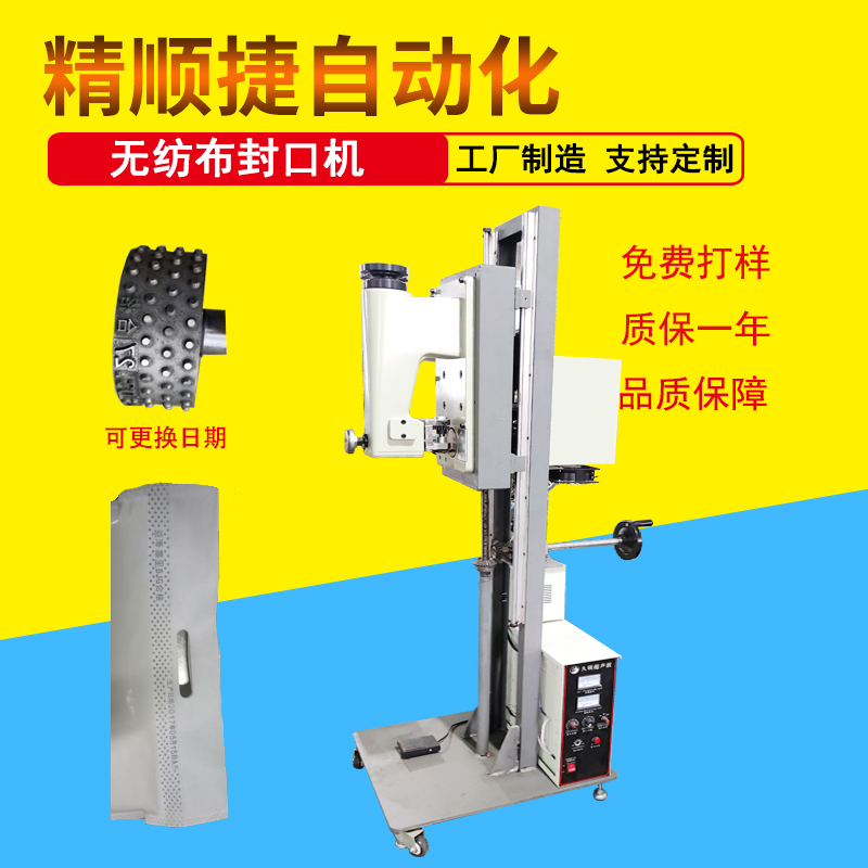 立体无纺布面粉小米袋封口机 超声波无线缝口机 选择精顺捷享工厂价适合于面粉袋、小米袋、化肥袋、粉末封装袋、塑料袋封口又叫超声波封口机,无线编织袋缝纫机,超声波花边缝合机,超声波花边机、超声波压花机,是一种的缝合、焊接,压花设备。中文名超声波缝口机应用合成纤维布料的缝边、压边、封边、熔接、熔切、压花等