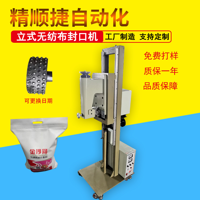 直立式无纺布面粉袋封口机 超声波小米袋无线封口机主要用于合成纤维布料的缝边、熔接、熔切、压花等,加工产品具有水密性好,生产效率高,不用针线辅料,熔切面平滑无毛边,手感好等特点